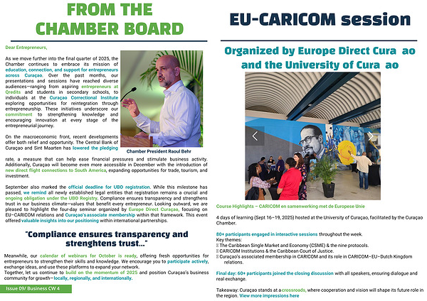 September also marked the official deadline for UBO registration. While this milestone has passed, we remind all newly established legal entities that registration remains a crucial and ongoing obligation under the UBO Registry. Compliance ensures transparency and strengthens trust in our business climate—values that benefit every entrepreneur. Looking outward, we are pleased to highlight the four-day seminar organized by Europe Direct Curaçao, focusing on EU–CARICOM relations and Curaçao’s associate membership within that framework. This event