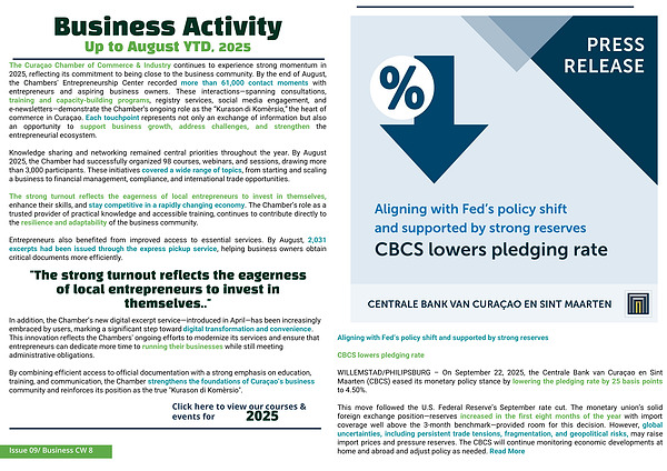 The Curaçao Chamber of Commerce & Industry continues to experience strong momentum in 2025, reflecting its commitment to being close to the business community. By the end of August, the Chambers' Entrepreneurship Center recorded more than 61,000 contact moments with entrepreneurs and aspiring business owners. These interactions—spanning consultations, training and capacity-building programs, registry services, social media engagement, and e-newsletters—demonstrate the Chamber’s ongoing role as the “Kurason di Komèrsio,” the heart of commerce in Curaçao. Each touchpoint represents not only an exchange of information but also an opportunity to support business growth, address challenges, and strengthen the